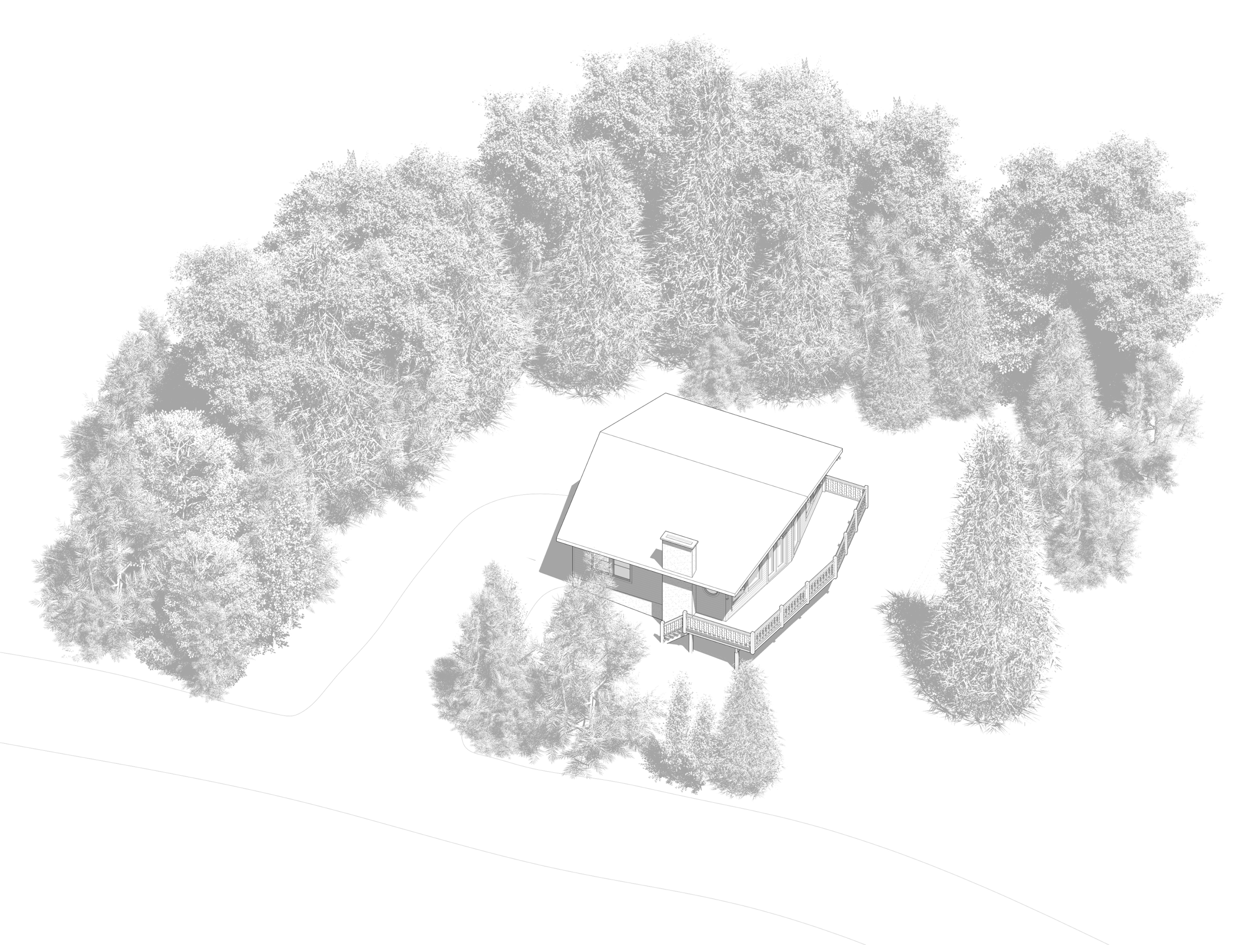 Le parti architectural s’est développé par l’analyse de la volumétrie du bâtiment existant; les formes et les pentes de toit combinées à la forme irrégulière du lot ont généré un nouveau volume articulé. Cette structure reprend les mêmes pentes de toit que la résidence existante et se subordonne au corps principal. La nouvelle toiture est fragmentée en plusieurs sections qui répondent aux différents usages qu’elles couvrent; le vestibule d’entrée, l’abri auto et une zone rangement.