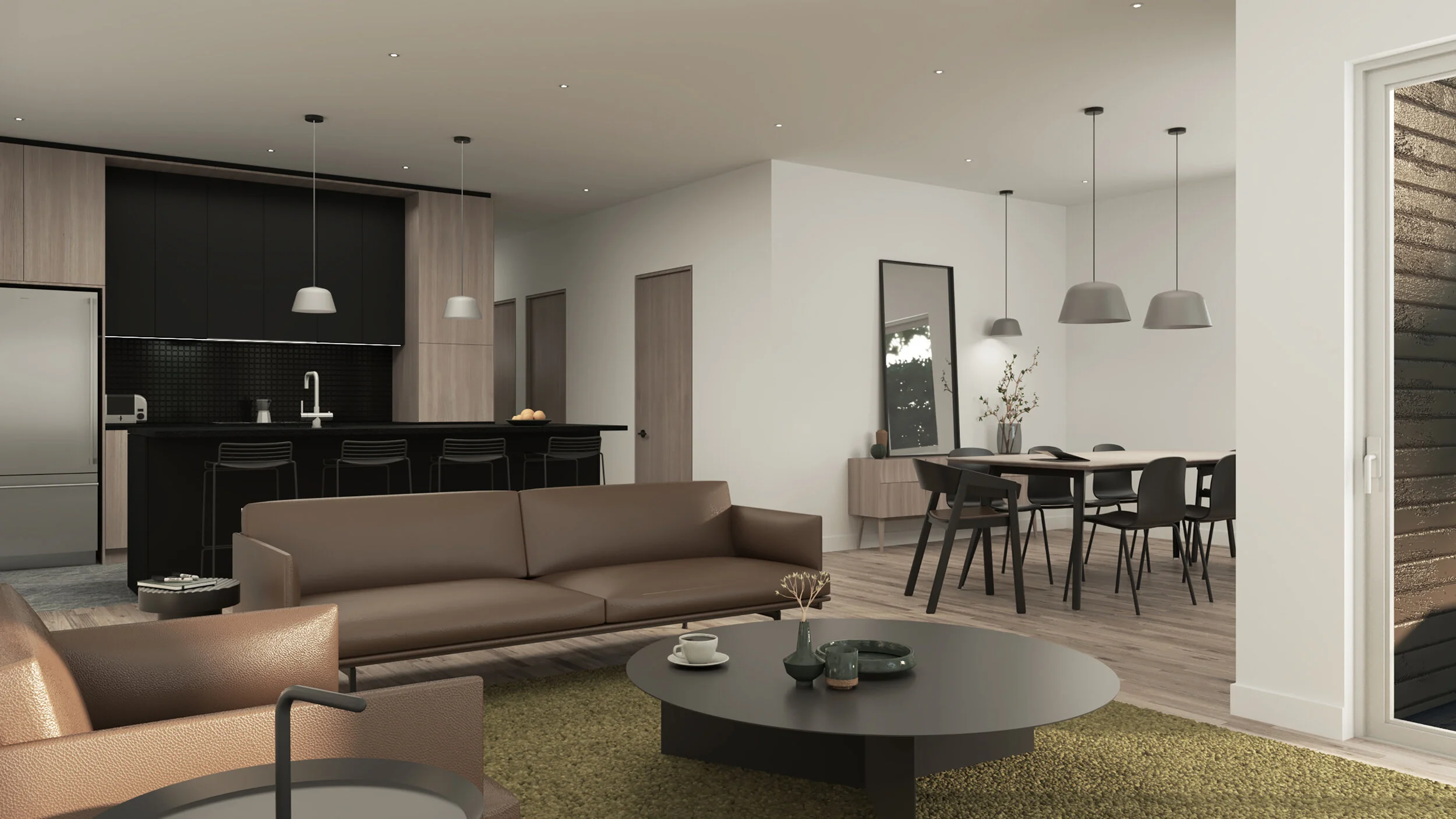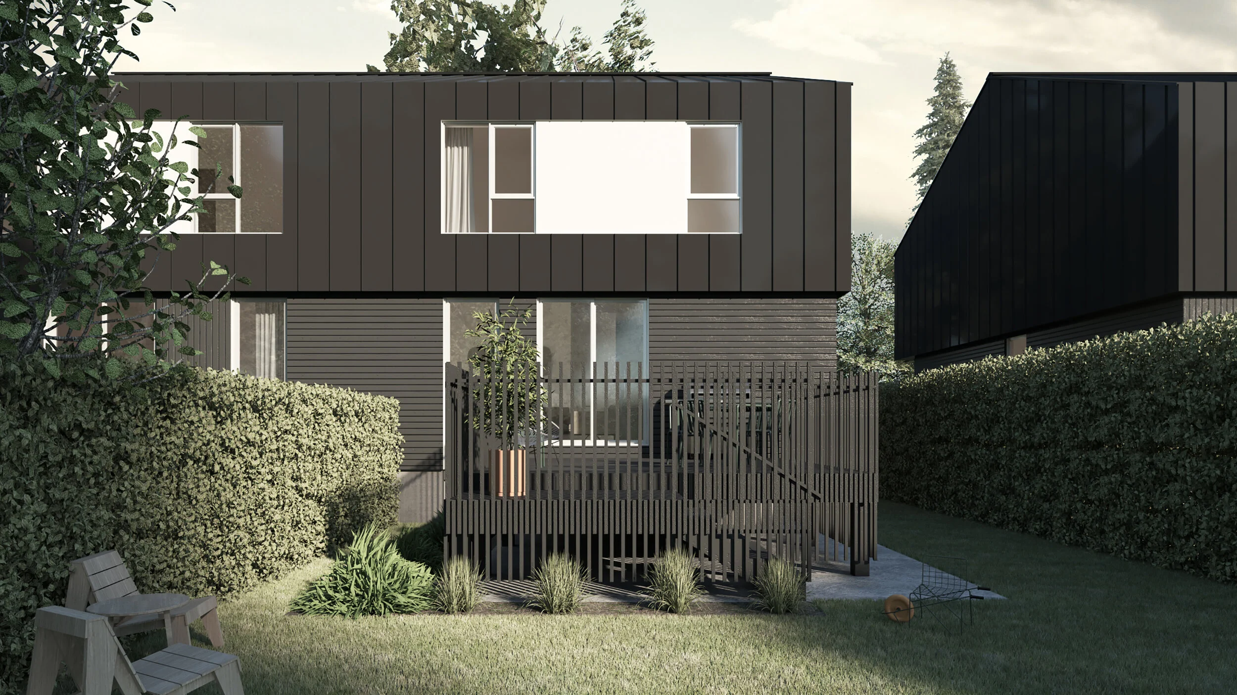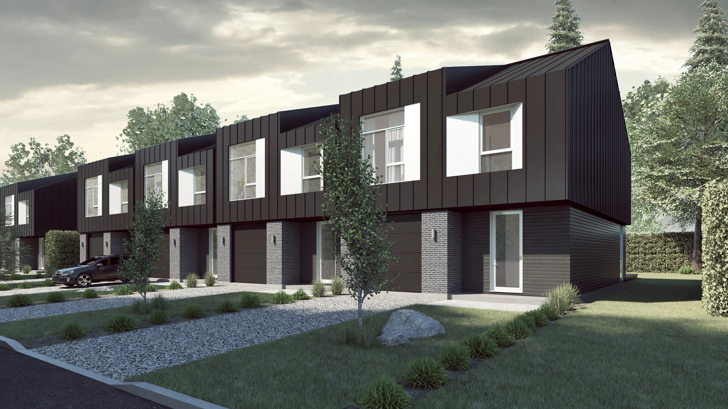 Ces habitations proposent une approche distinctive aux développements de quartiers résidentiels en zone périurbaine en formant un ensemble architectural varié tout en portant un parti architectural harmonisé.