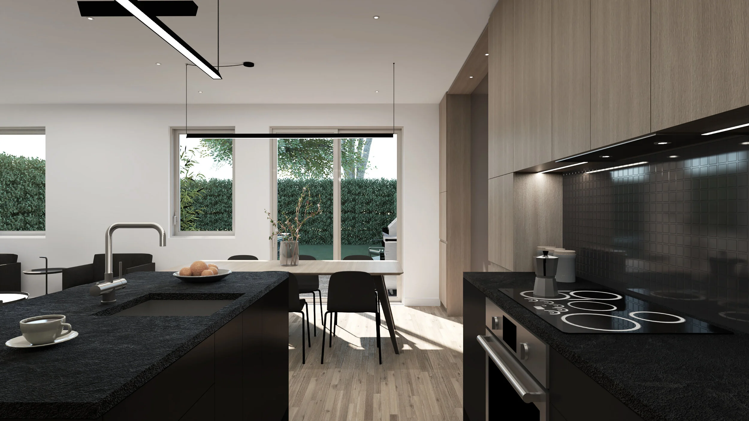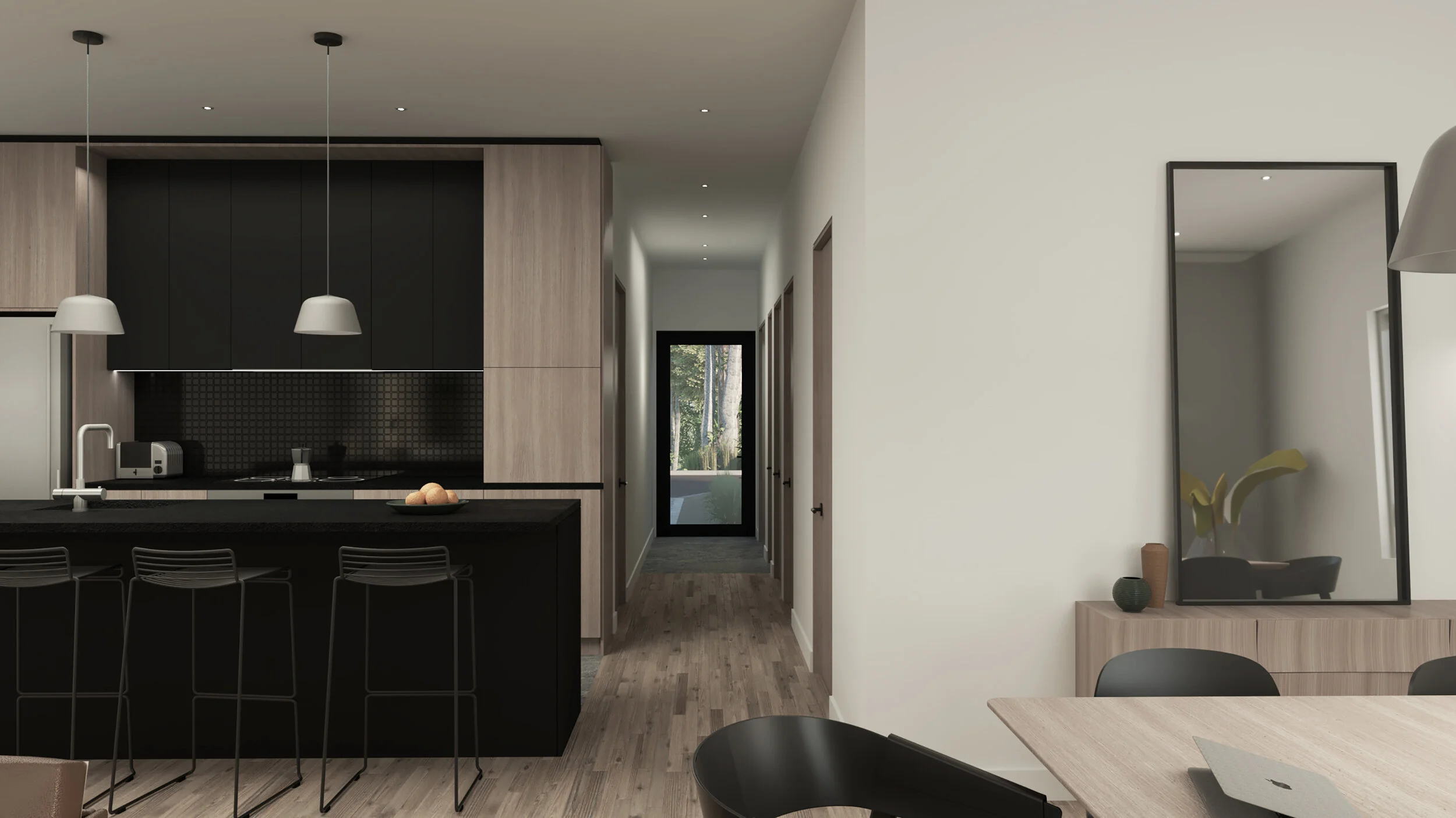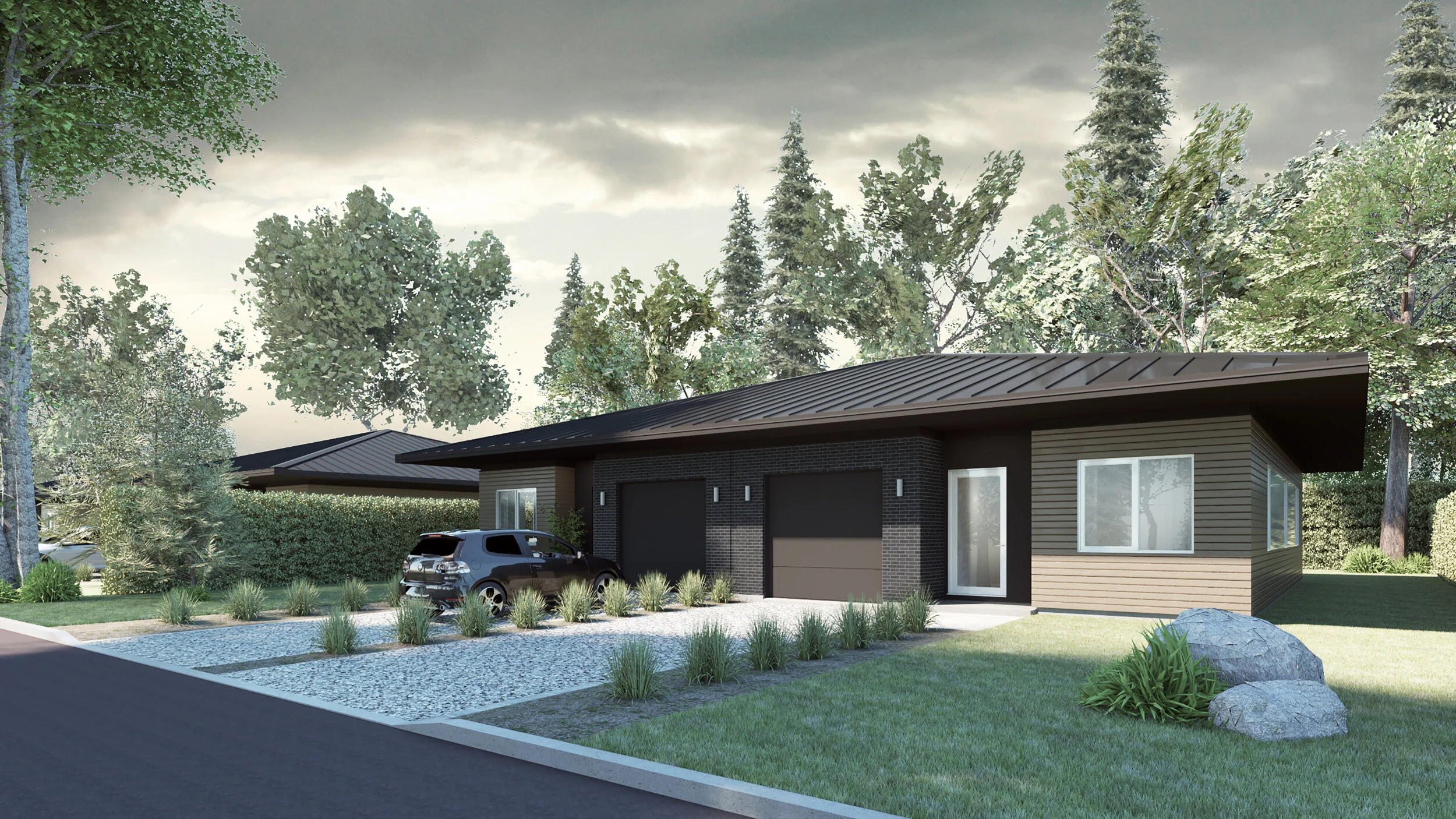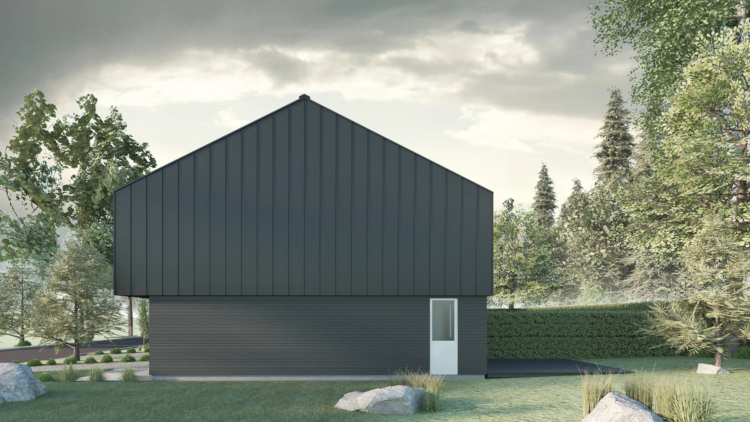Le parti architectural est lié à la matérialité. Le bois, l’acier et la brique sont utilisés comme parement des différents volumes qui logent chacun une fonction différente. Par la tectonique des matériaux extérieurs, l’architecture parle de son organisation. Le sens d’installation du parement de bois distingue les niveaux et les volumes entre eux alors que la brique est utilisée pour cadrer l’ouverture des portes de garage. L’acier est utilisé en revêtement de toiture et comme revêtement de l’étage. Les intérieurs sont flexibles dans leur organisation et sobres et intemporels dans leur matérialité.