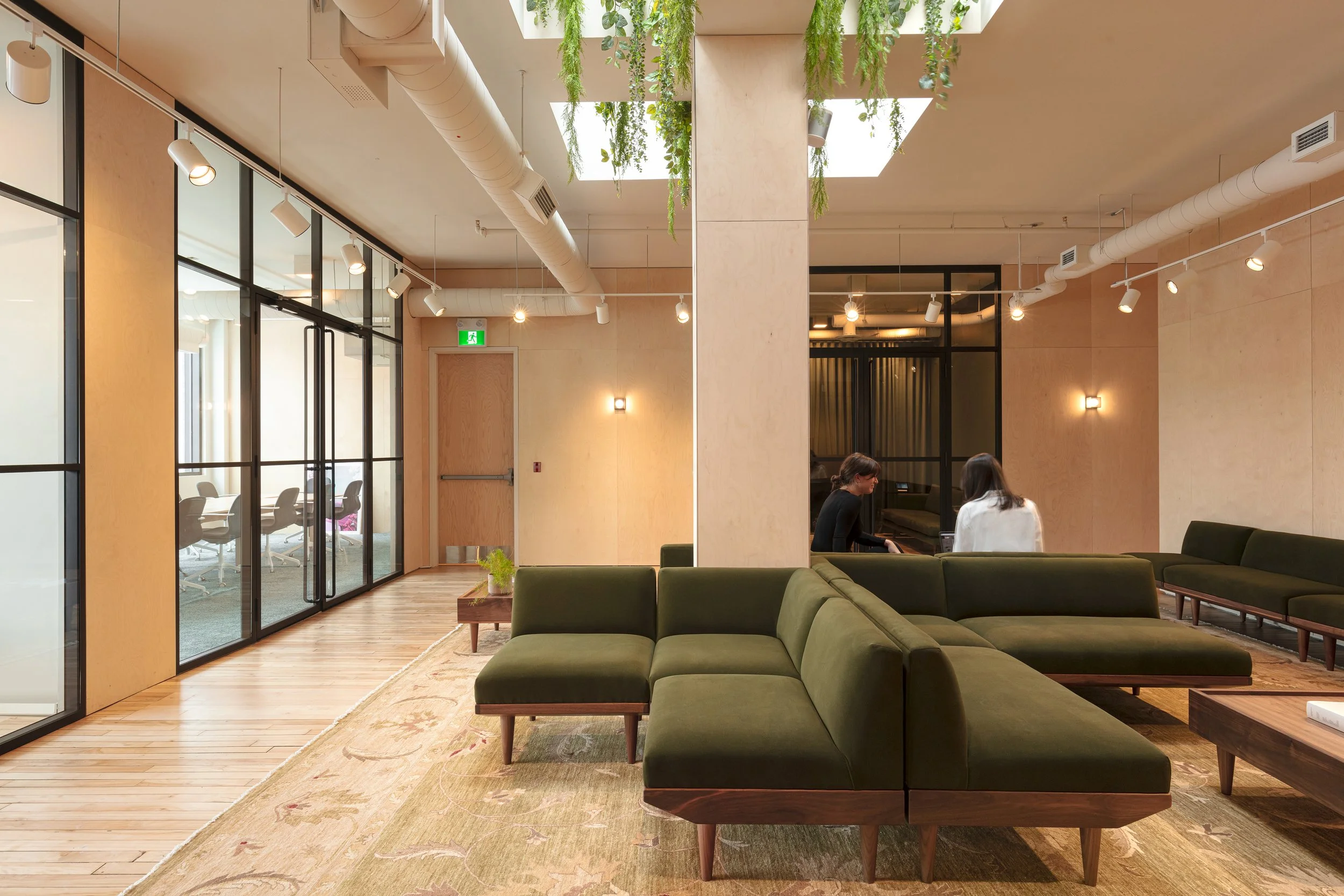Le traitement de la façade sur rue a reçu une attention particulière. Les nouveaux bureaux devaient s’implanter avec sobriété tout en affirmant une contribution à la revitalisation de la Plaza. De plus, l’équipe de TUX désirait un parement de brique ayant de la « personnalité ». Dans cet esprit, des jeux d’appareillage et des accents en acier Corten marquent les entrées et l’espace commercial au rez-de-chaussée. À l’étage, au-dessus du niveau de la marquise, de grandes baies fenestrées ouvrent les espaces de travail sur le paysage typique de La Petite-Patrie.