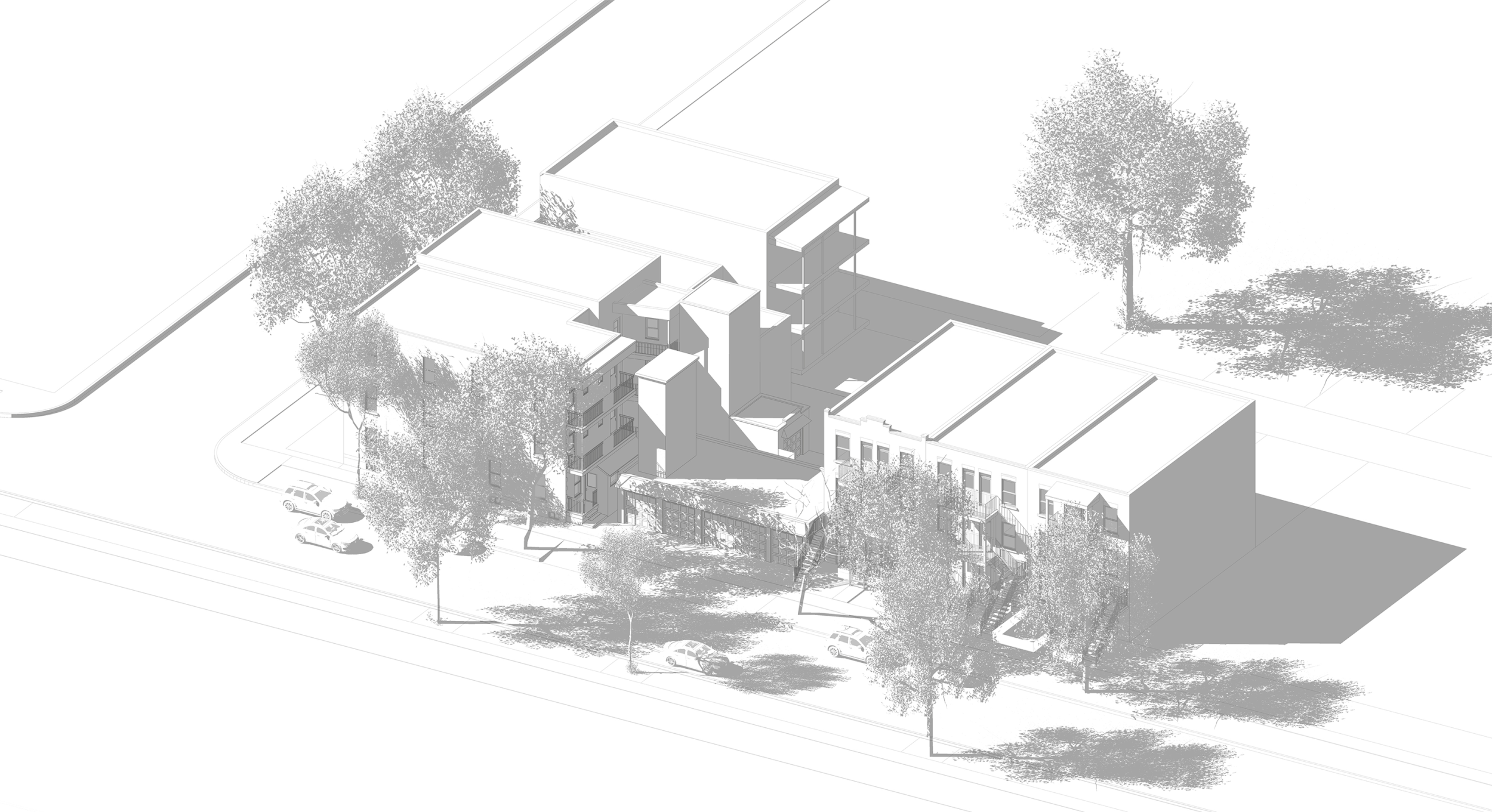 Situé sur le Parc-Molson, dans quartier Rosemont – La Petite-Patrie à Montréal, un bâtiment accessoire occupait la cour arrière d’un cinqplex depuis des décennies. Le propriétaire des lieux, conscient de la pénurie de logements subsistant à Montréal, souhaitait explorer les options pour remplacer ce bâtiment annexe par quelques unités d’habitation.